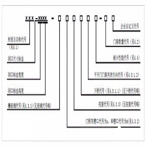 防火門標(biāo)記示例1:GFM-0924-bslk5A1.50(甲級)-1。表示隔熱(A類)鋼質(zhì)防火門,其洞口寬度為900mm,洞口高度為2400mm,門扇鑲玻璃、門框雙槽口、帶亮窗、有下框,門扇順時(shí)針方向關(guān)閉,耐火完整性和耐火隔熱性的時(shí)間均不小于1.50h的甲級單扇防火門。防火門標(biāo)記示例2:MFM-1221-d6B1.00-2。表示部分隔熱(B類)木質(zhì)防火門,其洞口寬度為1200mm,洞口高度為2100mm,門扇無玻璃、門框單槽口、無亮窗、無下框門扇逆時(shí)針方向關(guān)閉,其耐火完整性的時(shí)間不小于1.00h、耐火隔熱性的時(shí)間不小于0.50h的雙扇防火門。