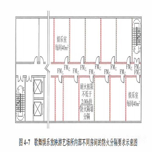 4.3.7 歌舞娛樂(lè)放映游藝場(chǎng)所的布置和分隔應(yīng)符合下列規(guī)定:3 房間之間應(yīng)采用耐火極限不低于2.00h的防火隔墻分隔;4 與建筑的其他部位之間應(yīng)采用防火門、耐火極限不低于2.00h的防火隔墻和耐火極限不低于1.00h的不燃性樓板分隔。
