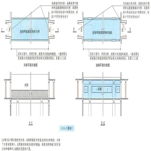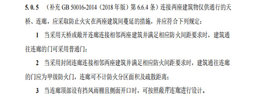 但是,《建規(guī)》并沒有明確“防止火災(zāi)在兩座建筑間蔓延的措施”具體是什么措施,比如建筑通往連廊的門是否應(yīng)采用防火門等等。