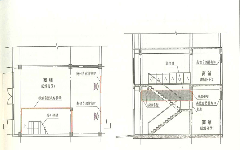 (1)敞開樓梯間開口部位是否應設置擋煙垂壁?