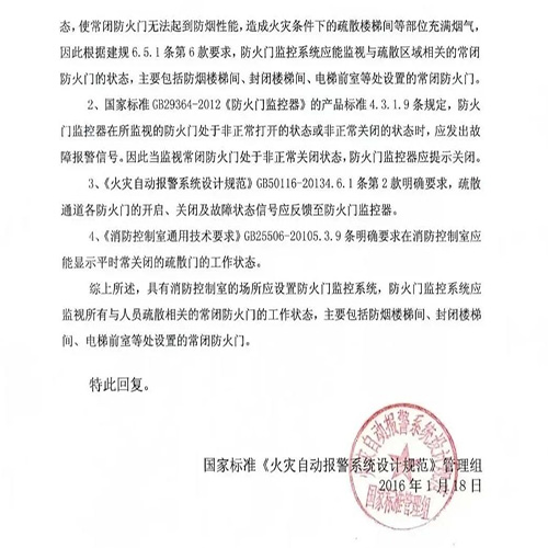 前些年也有一家設(shè)計(jì)單位發(fā)函給《火規(guī)》國家標(biāo)準(zhǔn)管理組,管理組回函如下: