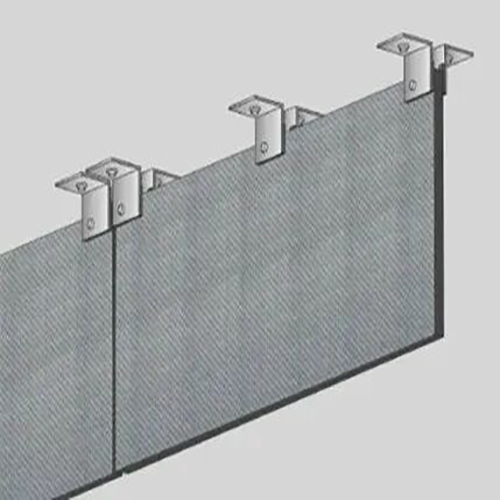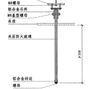 在人工和手動(dòng)吸盤(pán)扶正下慢慢將玻璃對(duì)準(zhǔn)夾具孔,穿上不銹鋼螺栓,兩邊套上2mm厚耐火墊圈,擰緊螺母固定玻璃夾。調(diào)整第一塊玻璃的高度,垂直度達(dá)到要求,在這一道擋煙垂壁上隨后安裝的玻璃均以此為準(zhǔn)。