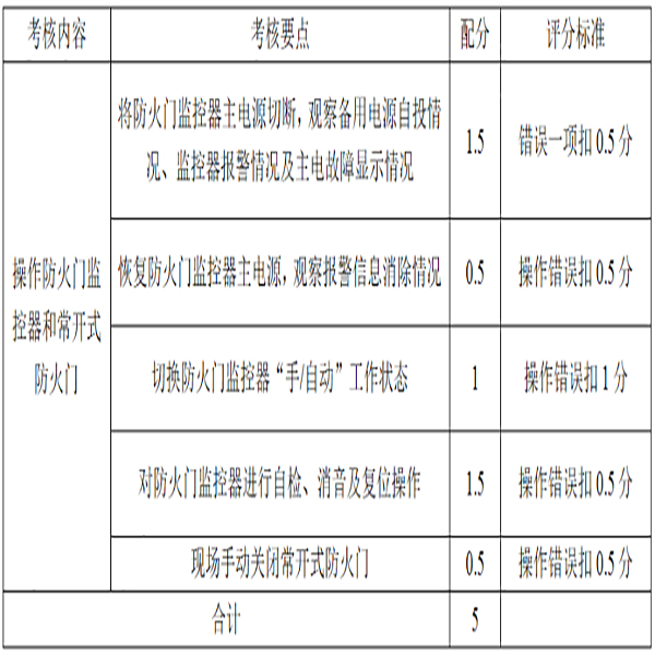 防火門操作考核內(nèi)容防火門的操作方法??己藰藴?.正確對防火門監(jiān)控器主電和備電自動切換功能進行測試; 2.正確排除電源的故障狀態(tài); 3.正確判斷并切換防火門監(jiān)控器的手動/自動控制狀態(tài); 4.正確對防火門監(jiān)控器進行自檢、消音及復(fù)位操作; 5.正確現(xiàn)場手動關(guān)閉常開式防火門并查看信號反饋情況。 考核方式模擬操作或現(xiàn)場操作。