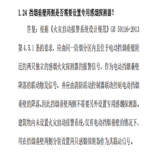 答復:根據(jù)《火災自動報警系統(tǒng)設計規(guī)范》GB 50116-2013第 4.5.1 條的要求,應由同一防煙分區(qū)內(nèi)且位于電動擋煙垂壁附近的兩只獨立的感煙火災探測器的報警信號,作為電動擋煙垂壁降落的聯(lián)動觸發(fā)信號,并應由消防聯(lián)動控制器聯(lián)動控制電動擋煙垂壁的降落。因此擋煙垂壁兩側(cè)不需要另外設置專用感煙探測器。建筑物內(nèi)未設置火災自動報警系統(tǒng),僅有電動擋煙垂壁的情況下,可在擋煙垂壁兩側(cè)分別設置兩只感煙探測器作為其聯(lián)動信號。
