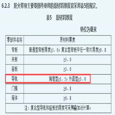 《防火卷簾》GB14102-2005第6.2.3條明確導軌厚度選型?! ?1)不允許導軌的厚度<1.5mm厚,若存在的厚度小于1.5mm的,可直接">